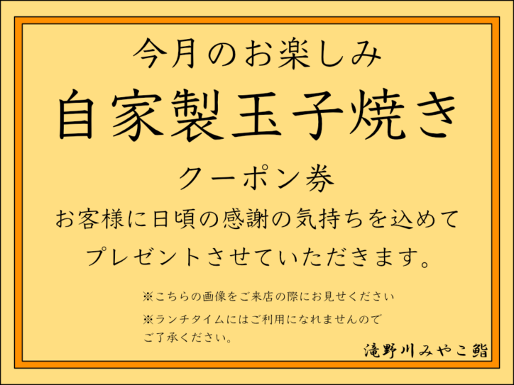 日頃のご愛顧に感謝の気持ちを込めて月替わりのクーポン券をプレゼントさせて頂きます。クーポン券をお見せください。